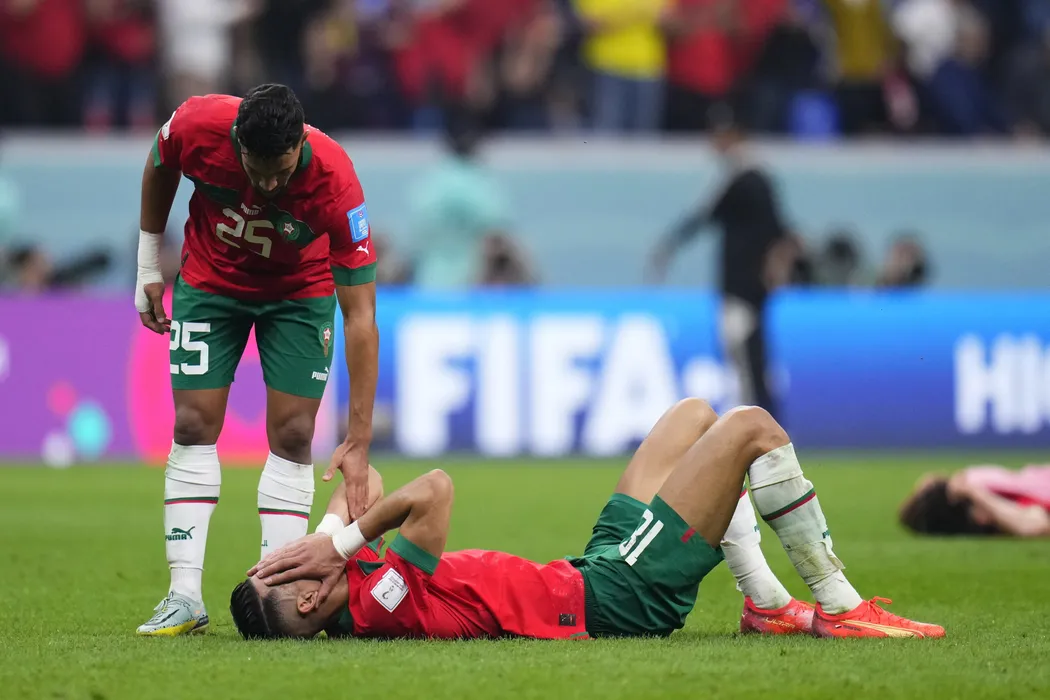 Morocco's Yahia Attiyat Allah consoles a teammate at the end of the World Cup semifinal soccer match between France and Morocco at the Al Bayt Stadium in Al Khor, Qatar, Wednesday, Dec. 14, 2022. France won 2-0 and will play Argentina in Sunday's final. (AP Photo/Manu Fernandez)