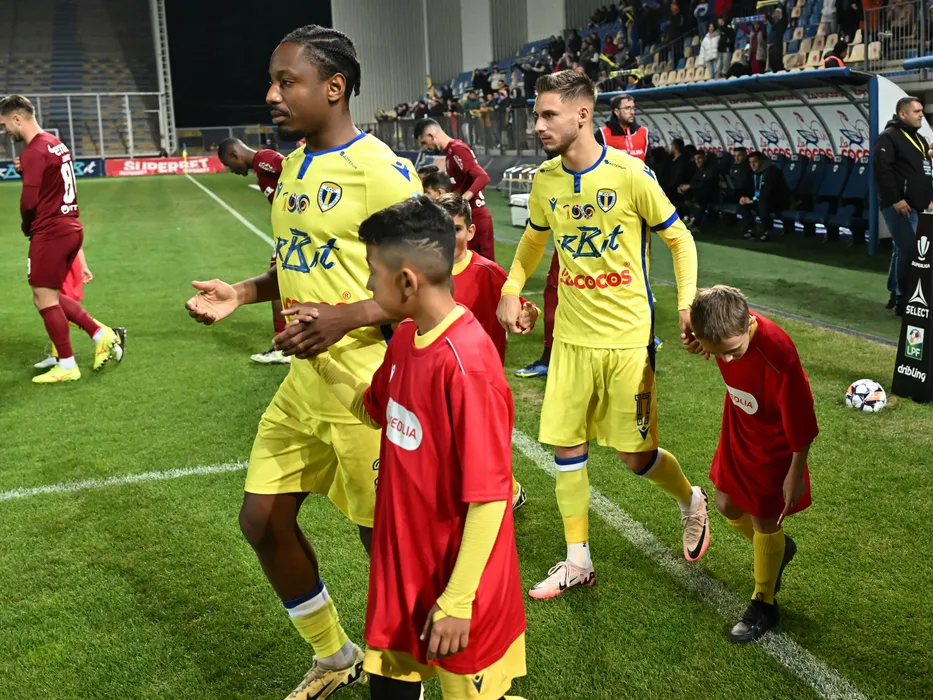 Fotbaliștii ploieșteni Tidiane Keita si Mihnea Gabriel Radulescu intra pe teren la meciul de fotbal dintre Petrolul Ploiesti si CFR Cluj, din cadrul Superligii Superbet, desfasurat pe Stadionul Ilie Oana din Ploiesti, sambata 19 octombrie 2024. © FOTO:Razvan Pasarica/SPORT PICTURES