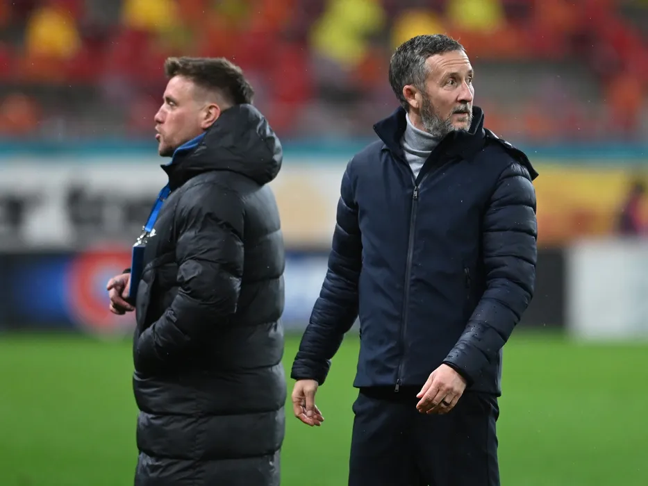 Mihai Pintilii si Mihai Stoica discuta dupa meciul de fotbal dintre FCSB si Farul Constanta, contand pentru Play-off-ul Superligii Superbet, desfasurat pe Arena Nationala din Bucuresti, luni 17 aprilie 2023.,Image: 770209091, License: Rights-managed, Restrictions: , Model Release: no
