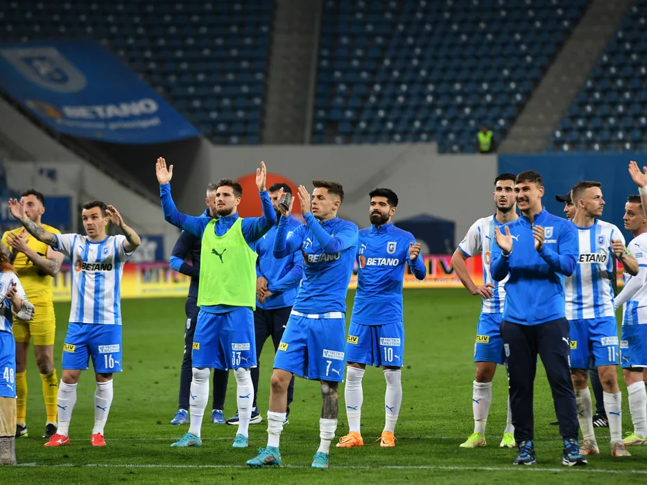 Fotbalistii craioveni Dan Nicolae Nistor, Mihai Cristian Capatina, Alexandru George Cimpanu, Ionut Daniel Vina, Andrei Virgil Ivan, Jovan Markovic si Nicusor Silviu Bancu saluta galeria dupa dupa meciul de fotbal dintre Universitatea Craiova si FC Voluntari, contand pentru Play-off-ul Ligii 1 Casa Pariurilor, desfasurat pe Stadionul Ion Oblemenco din Craiova, sambata 30 aprilie 2022. © FOTO:Razvan Pasarica/SPORT PICTURES