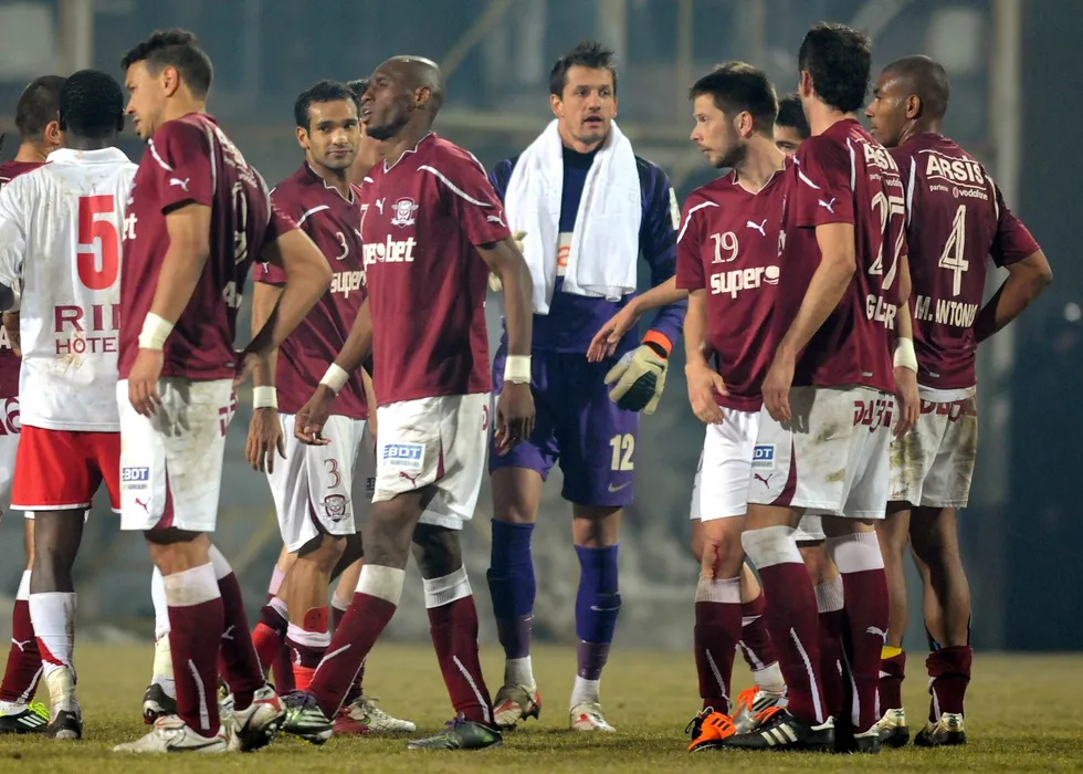 Fotbalistii rapidisti Vargas Cassio,Tavares Ezequias,Cesinha,Ema Dolha,Vladimir Bozovic si Marcos Antonio parasesc tristi terenul.