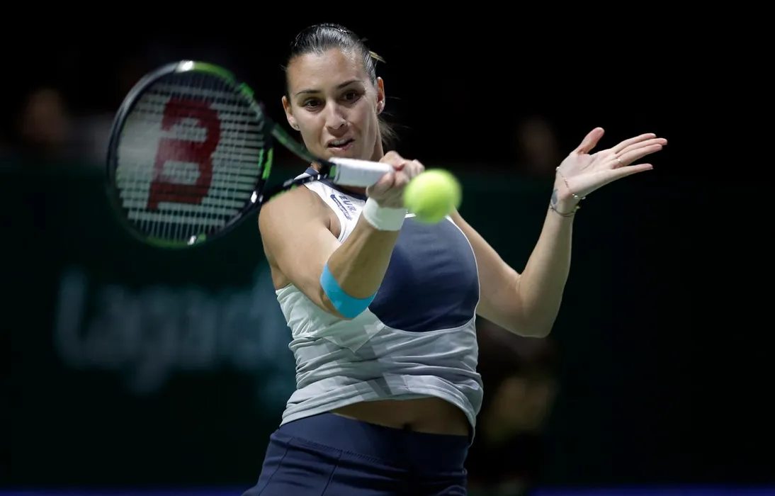 Flavia Pennetta of Italy makes a forehand return against Maria Sharapova of Russia during their singles match at the WTA tennis finals in Singapore on Thursday, Oct. 29, 2015.,Image: 583689294, License: Rights-managed, Restrictions: This content is intended for editorial use only. For other uses, additional clearances may be required., Model Release: no, Pictured: Flavia Pennetta,Maria Sharapova