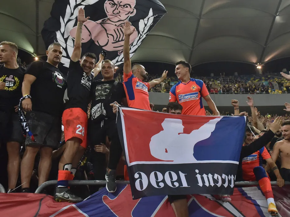 Claudiu Andrei Keseru, Risto Radunovic si Valentin Cretu canta alaturi de galerie dupa meciul de fotbal dintre FCSB si Dinamo Bucuresti, contand pentru Liga 1 Casa Pariurilor, desfasurat pe Arena Nationala din Bucuresti, duminica 12 septembrie 2021. © FOTO:Razvan Pasarica/SPORT PICTURES