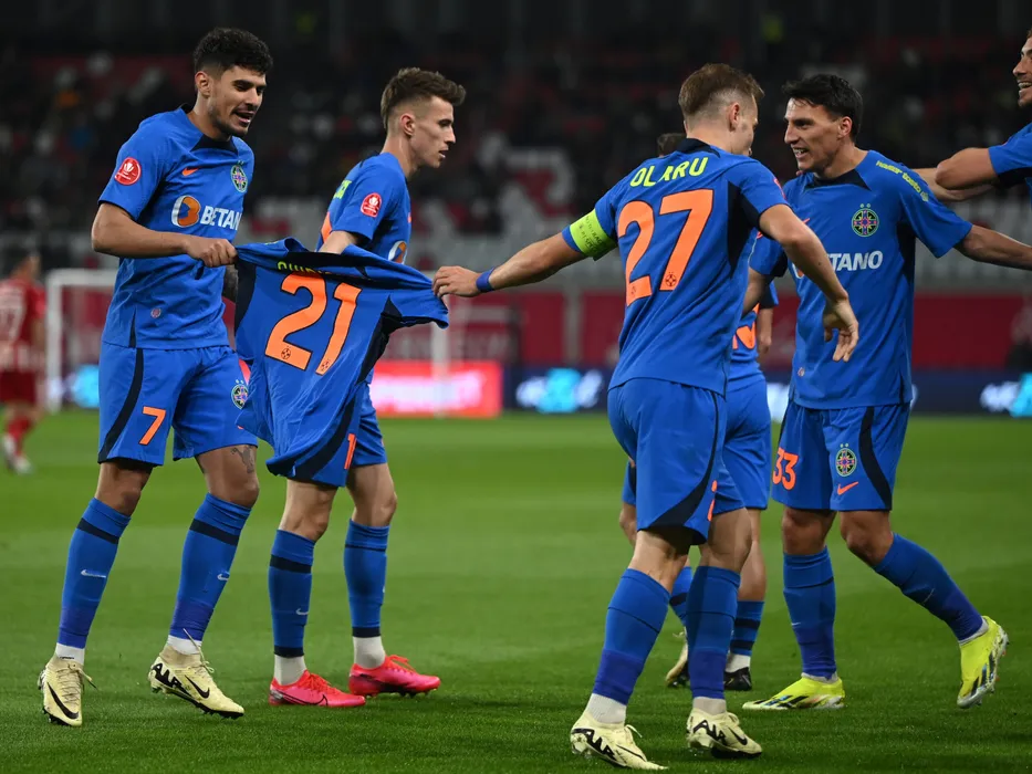 Bucurie a fotbalistilor stelisti Darius Dumitru Olaru, Octavian George Popescu si Risto Radunovic alături de tricoul lui Vlad Iulian Chiricheș dupa un gol marcat in meciul de fotbal dintre Sepsi OSK Sfantu Gheorghe si FCSB, contand pentru Play off-ul Superligii Superbet, desfasurat pe Sepsi Arena din Sfantu Gheorghe, miercuri 24 aprilie 2024. © FOTO:Razvan Pasarica/SPORT PICTURES