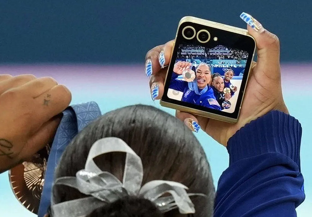 Paris Olympics: Artistic Gymnastics Jordan Chiles of the United States, bronze medalist in the women s artistic gymnastics floor exercise, takes a selfie with gold medalist Rebeca Andrade of Brazil and silver medalist Simone Biles of the United States during the medal ceremony at the Paris Olympics at Bercy Arena in Paris on Aug. 5, 2024. PUBLICATIONxINxAUTxBELxBIHxBULxCZExDENxESTxFINxFRAxGEOxGERxGRExHUNxISLxIRLxITAxLATxLTUxLUXxLIExMKDxNORxPORxPOLxROUxSVKxSUIxSRBxSLOxESPxTURxUKxUAExONLY A14AA0003259050P