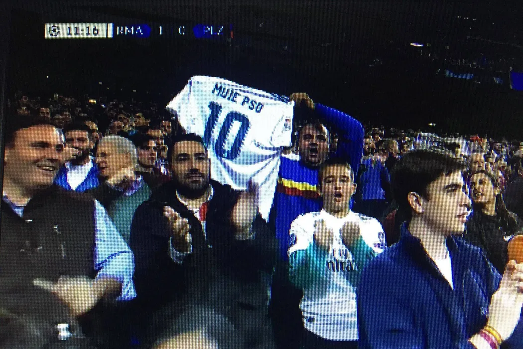 Mesajele contra PSD-ului au ajuns și pe Santiago Bernabeu. FOTO | Imaginea serii în Champions League, oferită de un fan român, imediat după golul lui Benzema
