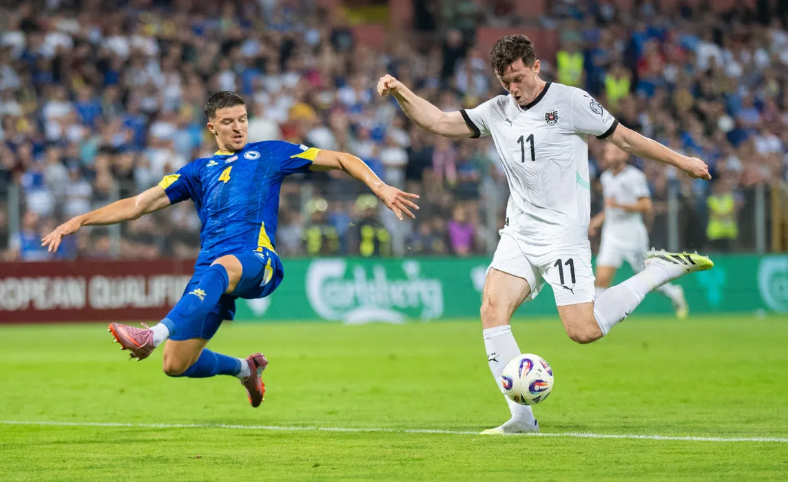 09 September 2025, Bosnia-Herzegovina, Zenica: Bosnia-Herzegovina's Tarik Muharemovic (L) and Austria's Michael Gregoritsch battle for the ball during the FIFA World Cup European Qualifiers soccer match between Bosnia Herzegovina and Austria at Bilino Polje Stadium. Photo: Georg Hochmuth/APA/dpa