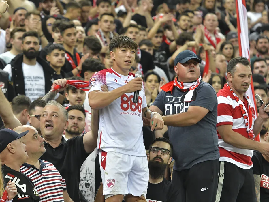 Costin Amzar canta alaturi de galerie dupa meciul de fotbal dintre Dinamo Bucuresti si FC Arges, contand pentru mansa tur a barajului de promovare in Superliga Superbet, desfasurat pe Arena Nationala din Bucuresti, luni 29 mai 2023. © FOTO:Razvan Pasarica/SPORT PICTURES