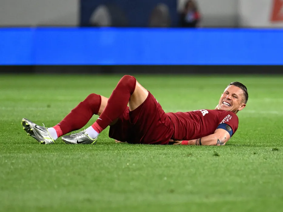 Ciprian Ioan Deac la pamant in meciul dintre Universitatea Craiova si CFR Cluj, contand pentru Play off-ul Superligii Superbet, desfasurat pe Stadionul Ion Oblemenco din Craiova, sambata 10 mai 2025. © FOTO:Razvan Pasarica/SPORT PICTURES