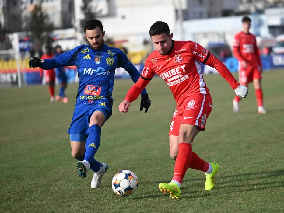 Cristi Marian Barbut si Antoni Valeri Ivanov in meciul dintre Unirea Slobozia si FC Hermannstadt, contand pentru Superliga Superbet, desfasurat pe Stadionul 1 Mai din Slobozia, sambata 31 ianuarie 2026. © FOTO:Razvan Pasarica/SPORT PICTURES