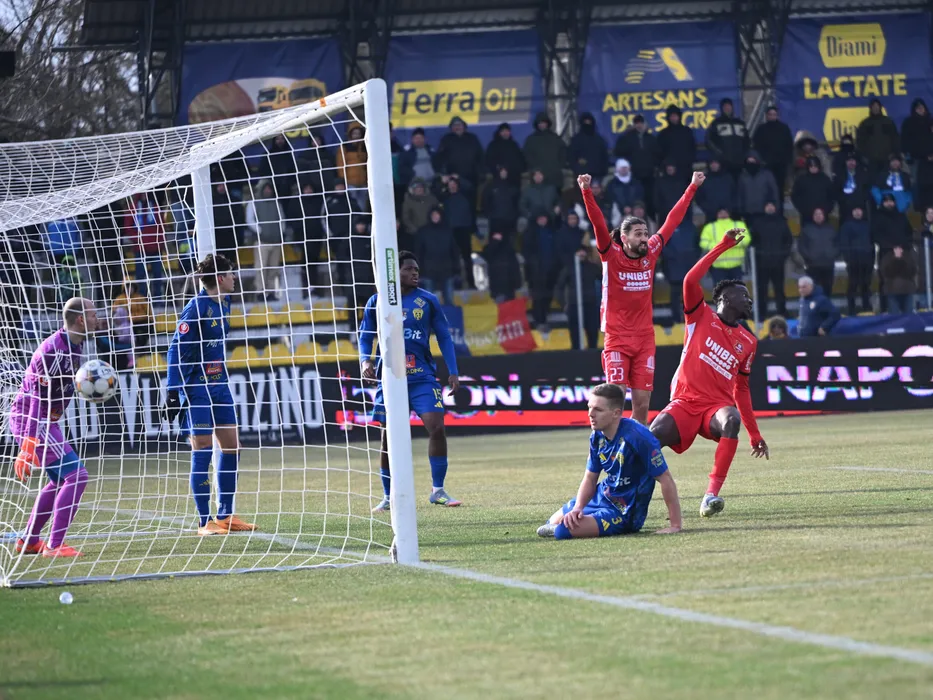 Nkama Christ Afalna marchează un gol de lângă Oleksandr Safronov sub privirile lui Denis Rusu, Eduard Marian Florescu si Marius Paul Antoche in meciul dintre Unirea Slobozia si FC Hermannstadt, contand pentru Superliga Superbet, desfasurat pe Stadionul 1 Mai din Slobozia, sambata 31 ianuarie 2026. © FOTO:Razvan Pasarica/SPORT PICTURES