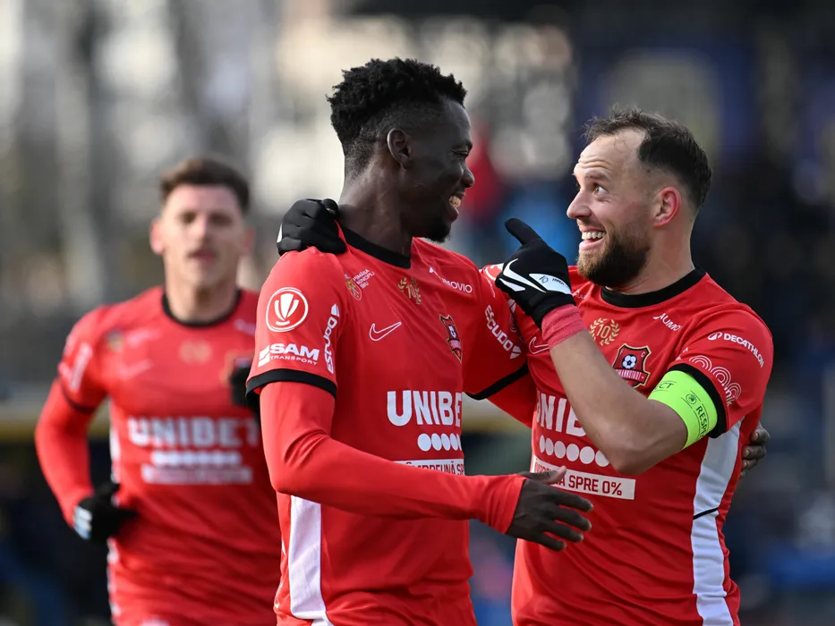 Bucurie a fotbalistilor sibieni Nkama Christ Afalna si Cristian Daniel Negut dupa un gol marcat in meciul dintre Unirea Slobozia si FC Hermannstadt, contand pentru Superliga Superbet, desfasurat pe Stadionul 1 Mai din Slobozia, sambata 31 ianuarie 2026. © FOTO:Razvan Pasarica/SPORT PICTURES