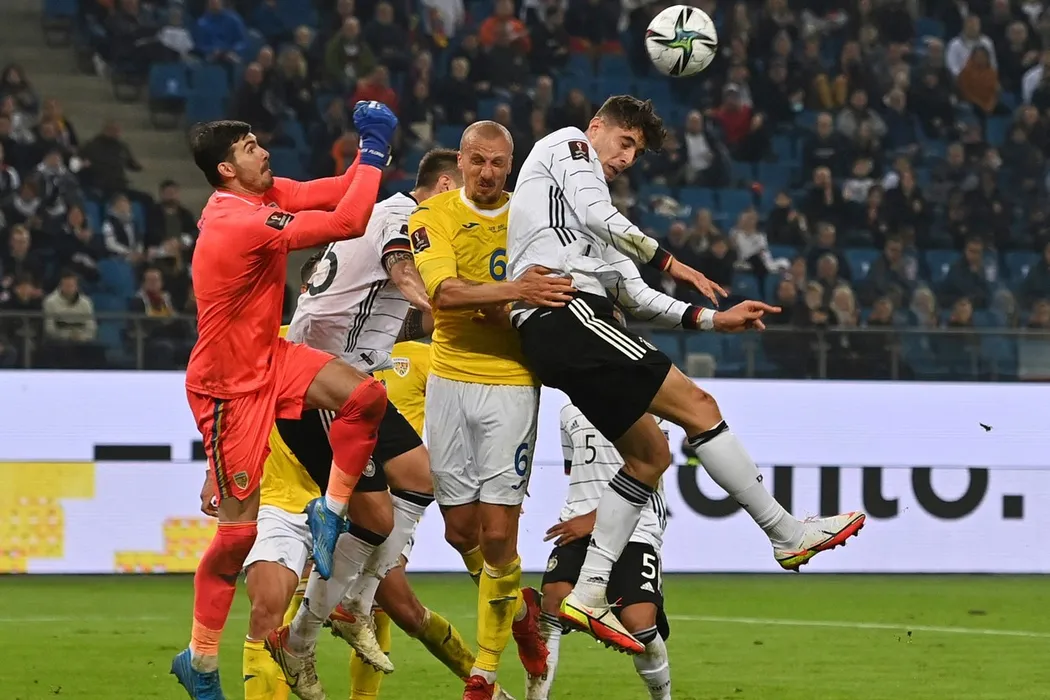 Penalty area scene - from right: Kai HAVERTZ (GER), Vlad CHIRICHES (ROM), Niklas SUELE (GER), goalwart Florin NITA (ROM), action, duels. Soccer Laenderspiel, World Cup qualification group J matchday 7, Germany (GER) - Romania (ROM) 2-1, on 08.10.2021 in Hamburg, Volksparkstadion.,Image: 637245162, License: Rights-managed, Restrictions: GERMANY OUT