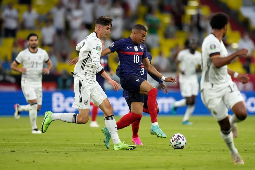 France's forward Kylian Mbappe (C-R) is marked by Germany's forward Kai Havertz (C-L) during the UEFA EURO 2020 Group F football match between France and Germany at the Allianz Arena in Munich on June 15, 2021.,Image: 615818645, License: Rights-managed, Restrictions: , Model Release: no, Credit line: Profimedia