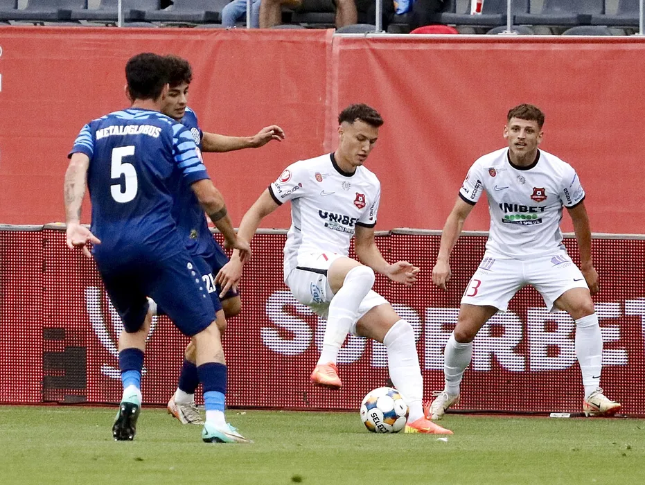 Luca Gabriel Stancu si Constantin Dragos Albu in meciul de fotbal dintre AFC Hermannstadt Sibiu si FC Metaloglobus Bucuresti, contand pentru Superliga Superbet, desfasurat pe Stadionul Municipal din Sibiu, vineri 18 iulie 2025. © FOTO:Valentin Macrea/SPORT PICTURES
