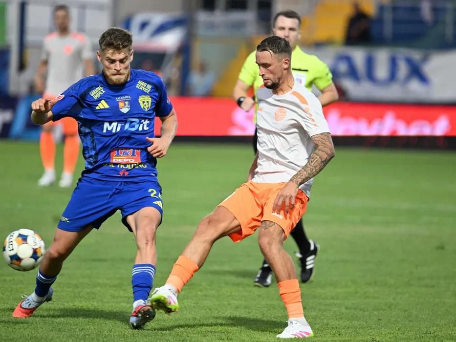 Vlad Marian Pop si Cornelis Petrus Ubbink in meciul dintre Unirea Slobozia si Metaloglobus Bucuresti, contand pentru Superliga Superbet, desfasurat pe Clinceni Arena din Clinceni, vineri 15 august 2025. © FOTO:Razvan Pasarica/SPORT PICTURES
