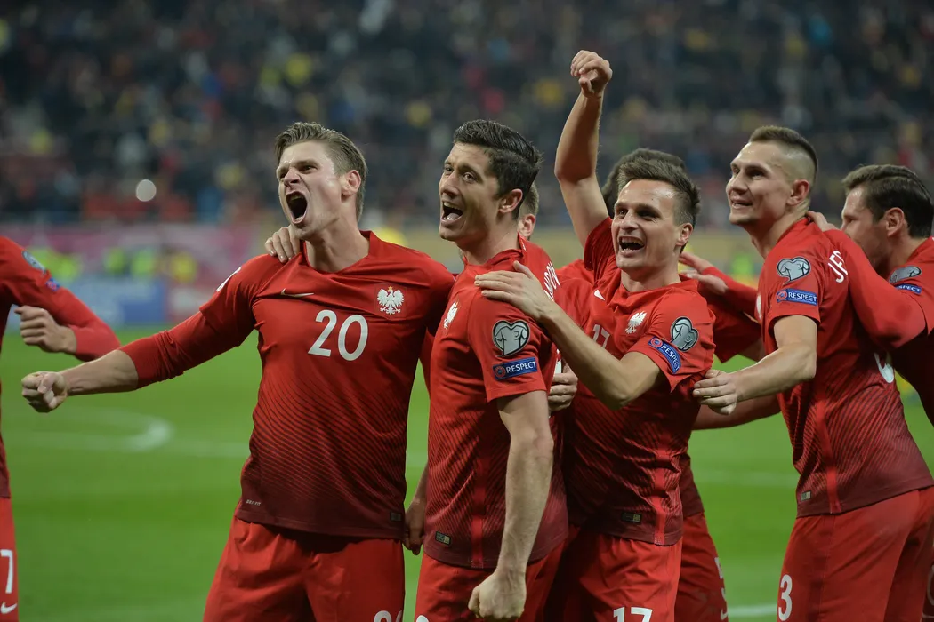 Robert Lewandowski (CS) se bucura alaturi de coechipieri dupa marcarea unui gol in timpul partidei dintre Romania si Polonia, contand pentru preliminariile Campionatului Mondial de fotbal, grupa E, vineri 11 Noiembrie 2016, pe Arena Nationala din Bucuresti. ALEXANDRU DOBRE/MEDIAFAX FOTO