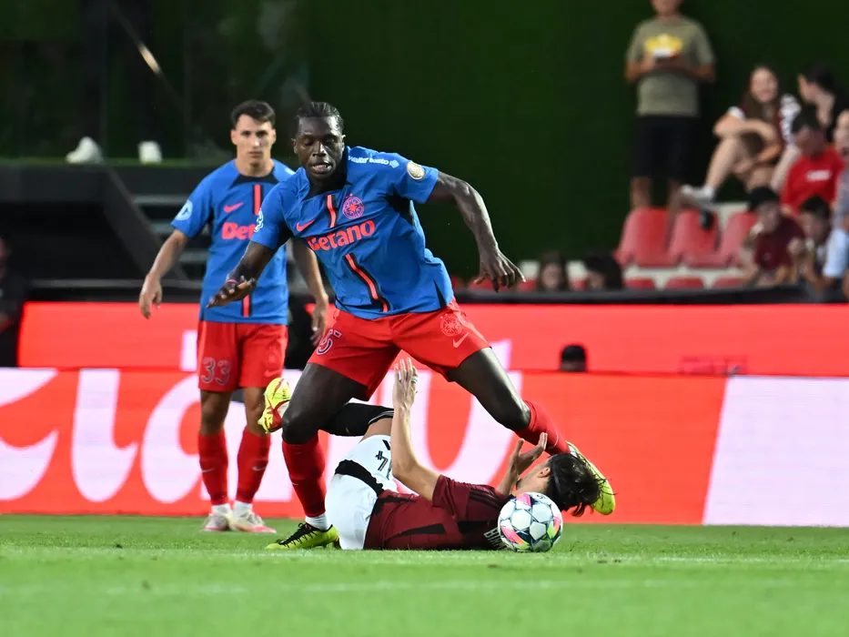 Joyskim Aurelien Dawa Tchakonte si Veljko Birmančević in meciul dintre Sparta Praga si FCSB, contand pentru Preliminariile Ligii Campionilor, desfasurat pe Stadionul Letna din Praga, marti 6 august 2024. © FOTO:Razvan Pasarica/SPORT PICTURES