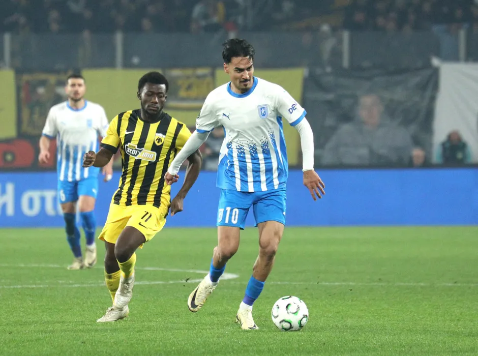 Stefan Baiaram si Aboubakary Koita in meciul de fotbal dintre AEK Atena si Universitatea Craiova, contand pentru Conference League, desfasurat pe AEK Arena din Atena, joi 18 decembrie 2025. © FOTO:Marius Diaconu/SPORT PICTURES