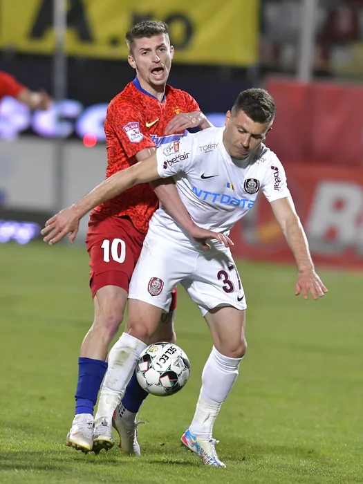 Florin Lucian Tanase si Mihai Bordeianu in meciul de fotbal dintre FCSB si CFR Cluj, contand pentru Play-off-ul Ligii 1 Casa Pariurilor, desfasurat fara spectatori pe Stadionul Marin Anastasovici din Giurgiu, luni 3 mai 2021. © FOTO:Razvan Pasarica/SPORT PICTURES