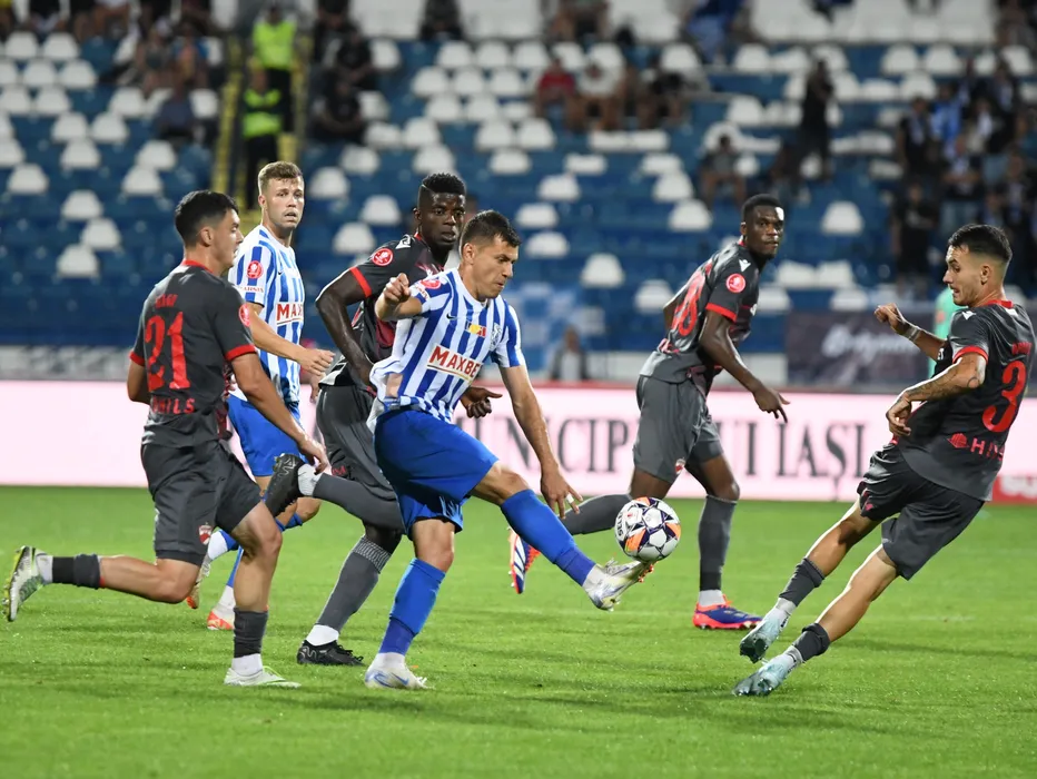 Mihai Cătălin Bordeianu și Vhakka Eddy Stelh Gnahore, Petru Neagu, Raul Marian Opruț, Kennedy Kofi Boateng în meciul de fotbal dintre Poli Iași si Dinamo București, contând pentru SuperLiga Superbet, desfășurat pe Stadionul Emil Alexandrescu din Iași, luni 12 august 2024. © FOTO: Tudi/SPORT PICTURES