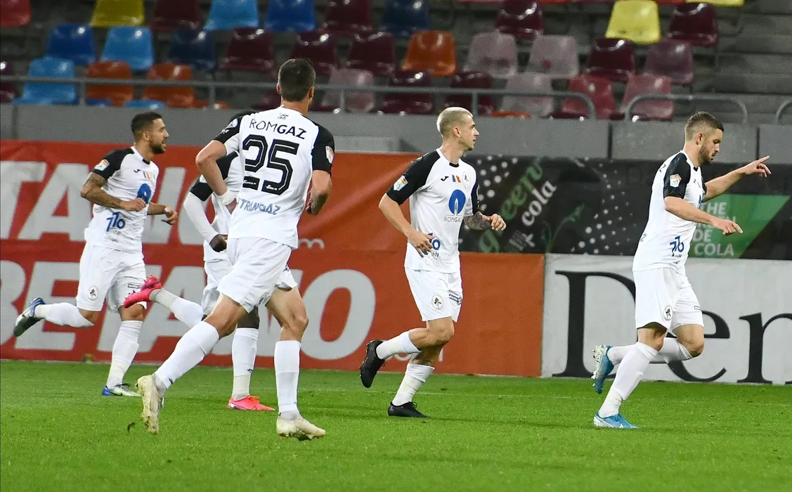 Sergiu Florin Bus se bucura dupa un gol marcat alaturi de Mihai Ionut Butean in meciul de fotbal dintre FCSB si Gaz Metan Medias, contand pentru play-off-ul Ligii 1 Casa Pariurilor, disputat fara spectatori pe Arena Nationala din Bucuresti, duminica 21 iunie 2020. © FOTO:Razvan Pasarica/SPORT PICTURES