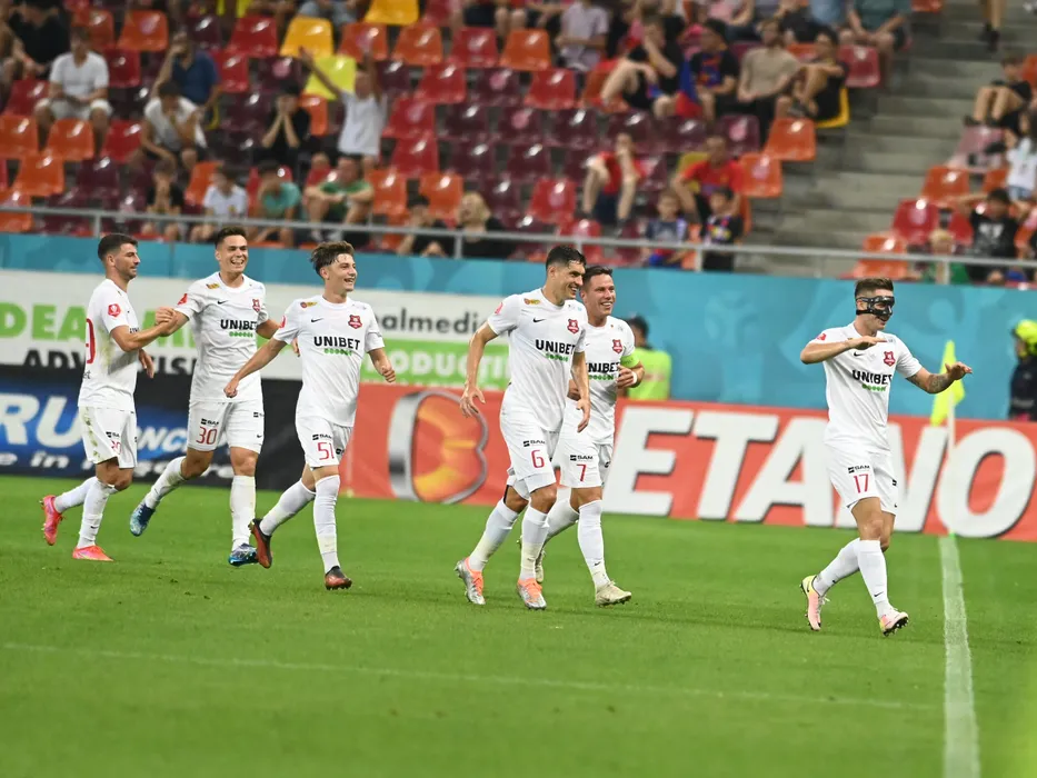 Bucurie a fotbalistilor sibieni Ciprian Ionut Biceanu, George Daniel Paraschiv, Alexandru Laurentiu Oroian, Paul Marius Antoche, Ionut Petrisor Petrescu si Mihai Ionut Butean dupa un gol marcat in meciul de fotbal dintre FCSB si FC Hermannstadt, contand pentru Superliga Superbet, desfasurat pe Arena Nationala din Bucuresti, duminica 28 august 2022. © FOTO:Razvan Pasarica/SPORT PICTURES
