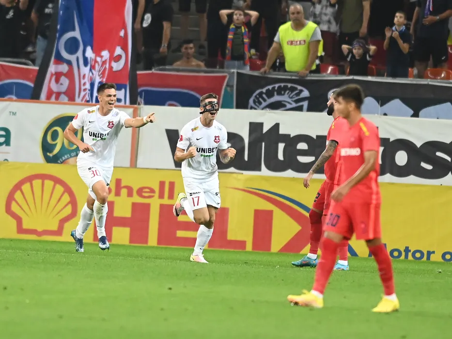 Mihai Ionut Butean se bucura dupa un gol marcat alaturi de George Daniel Paraschiv in meciul de fotbal dintre FCSB si FC Hermannstadt, contand pentru Superliga Superbet, desfasurat pe Arena Nationala din Bucuresti, duminica 28 august 2022. © FOTO:Razvan Pasarica/SPORT PICTURES