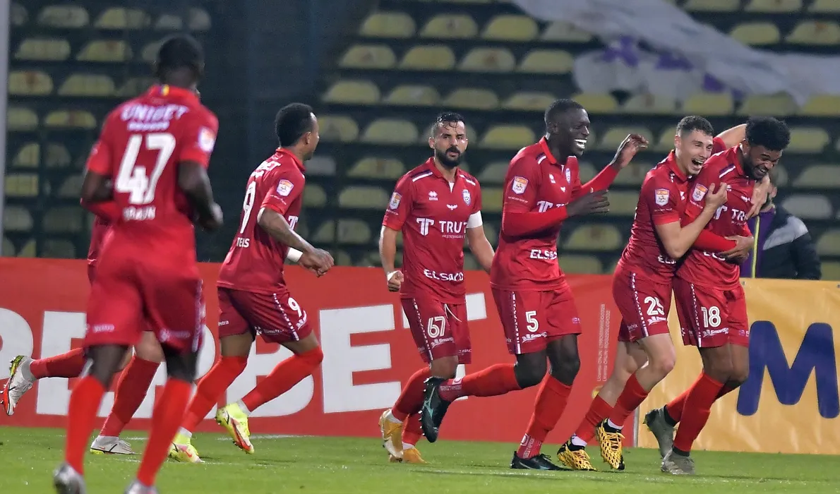 Bucurie a fotbalistilor botoseneni dupa un gol marcat cu Enriko Papa, Joyskim Aurelien Dawa Tchakonte, Bogdan Racovitan si Malcom Sylas Laouari Edjouma in meciul de fotbal dintre FC Arges si FC Botosani, contand pentru Liga 1 Casa Pariurilor, desfasurat pe Stadionul Nicolae Dobrin din Pitesti, vineri 5 noiembrie 2021. © FOTO:Razvan Pasarica/SPORT PICTURES