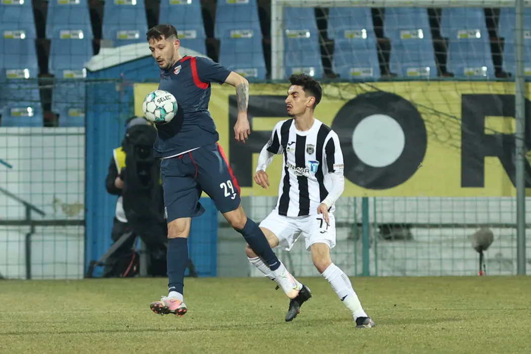 Mihai Alexandru Costea si Albert Tivadar Stahl in meciul de fotbal dintre Chindia Targoviste si Astra Giurgiu, contand pentru Liga a-1-a Casa Pariurilor, desfasurat fara spectatori pe Stadionul Gloria din Buzau, duminica 14 martie 2021. © FOTO:Gheorghe Fluster/SPORT PICTURES