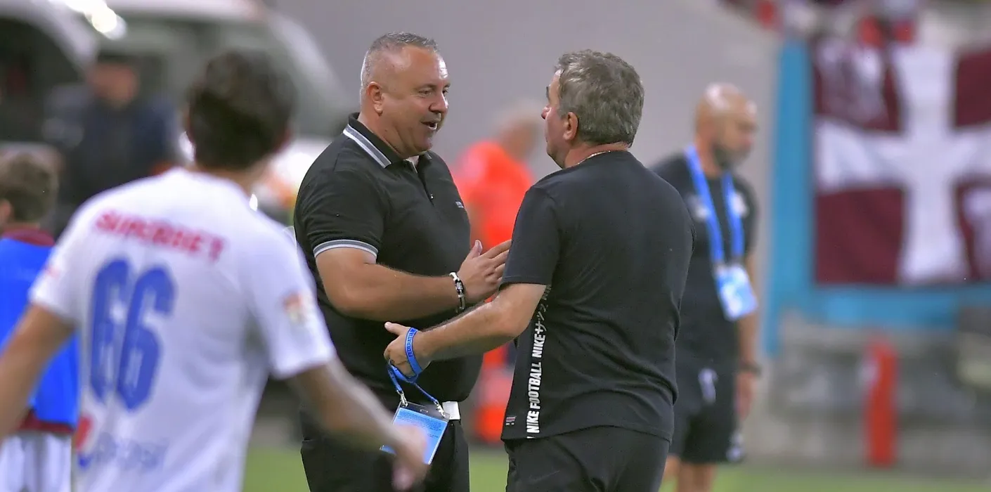 Mihai Iosif se saluta cu Gheorghe Hagi dupa meciul de fotbal dintre Rapid Bucuresti si Farul Constanta, contand pentru Liga 1 Casa Pariurilor, desfasurat pe Arena Nationala din Bucuresti, vineri 30 iulie 2021. © FOTO:Razvan Pasarica/SPORT PICTURES