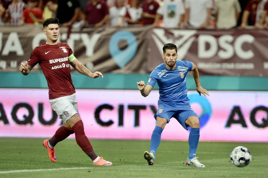 Cristian Sapunaru (S), de la Rapid, lupta pentru balon cu Daniel Florea (D), de la Chindia Targoviste in meciul de fotbal din prima etapa a Ligii 1, disputat pe Arena Nationala din Bucuresti, duminica, 18 iulie 2021. EDUARD VINATORU / MEDIAFAX FOTO