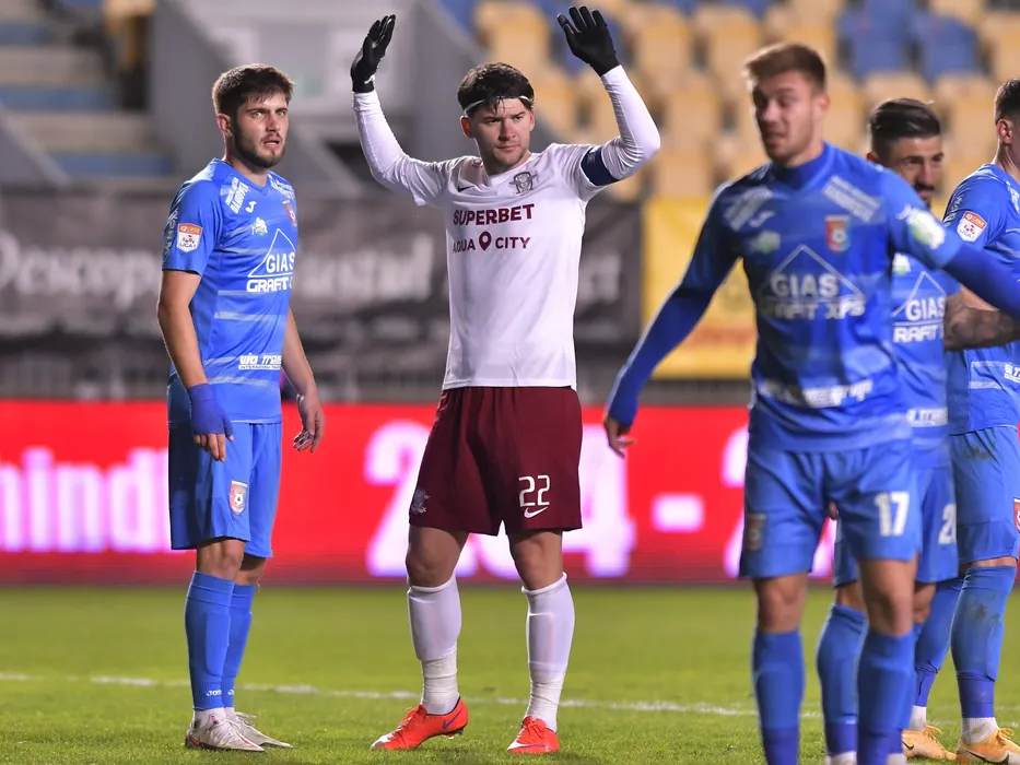 Tiberiu Ionut Capusa si Cristian Ionut Sapunaru in meciul de fotbal dintre Chindia Targoviste si Rapid Bucuresti, contand pentru Liga 1 Casa Pariurilor, desfasurat pe Stadionul Ilie Oana din Ploiesti, vineri 19 noiembrie 2021. © FOTO:Razvan Pasarica/SPORT PICTURES