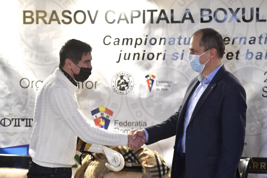 Mihai Leu (S) si Szenner Zoltan-Huba (D), vicepresedinte al Consiliului Judetean Brasov, participa la conferinta de presa prilejuita de organizarea, in premiera la Brasov, a competitiei internationale de box ,,Brasov Open 2022". Evenimentul, la care vor participa 250 de competitori din 30 de tari, va avea loc in perioada 22-28 februarie 2022. ALEX NICODIM / MEDIAFAX FOTO