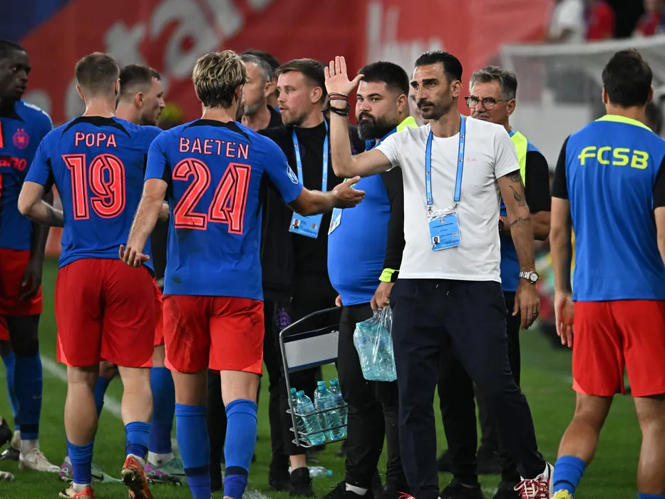 Elias Charalambous ii felicita pe elevii sai dupa un gol reusit în meciul de fotbal dintre FCSB și UTA Arad, contând pentru Superliga Superbet, desfășurat pe Stadionul Arcul de Triumf din București, duminică 1 septembrie 2024. © FOTO: Răzvan PĂSĂRICĂ/SPORT PICTURES
