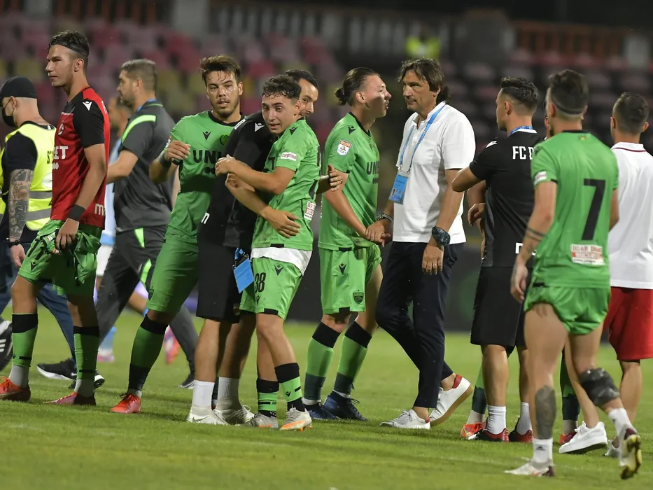 Dario Bonetti alaturi de fotbalistii dinamovisti Mihai Alexandru Neicutescu, Ahmed Andrei Mustafa Bani si Deniz Giafer idupa meciul de fotbal dintre Dinamo Bucuresti si FC Voluntari, contand pentru Liga 1 Casa Pariurilor, desfasurat pe Stadionul Dinamo din Bucuresti, luni 19 iulie 2021. © FOTO:Razvan Pasarica/SPORT PICTURES