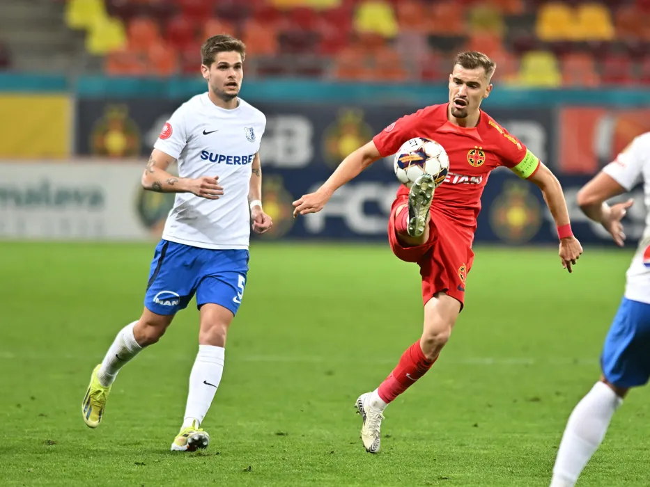 Diogo Lucas Queiros si Darius Dumitru Olaru în meciul de fotbal dintre FCSB si Farul Constanta, contând pentru Play off-ul Superligii Superbet, desfășurat pe Arena Nationala din Bucuresti, sambata 27 aprilie 2024. © FOTO: Răzvan PĂSĂRICĂ/SPORT PICTURES