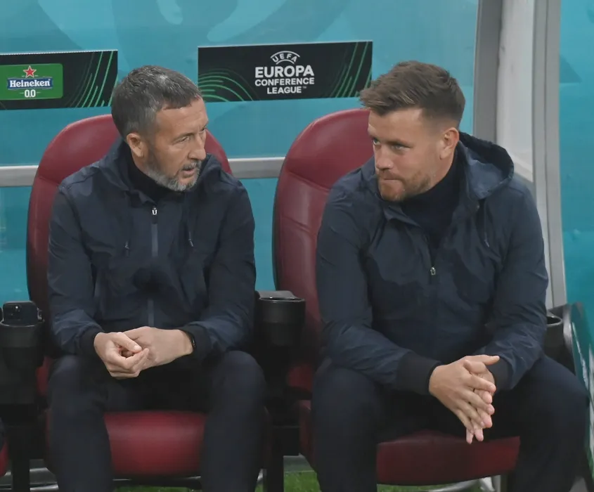 Lucian Filip, Marius Ianuli, Mihai Pintilii si Mihai Stoica la startul meciului de fotbal dintre FCSB si West Ham United, din cadrul grupelor UEFA Europa Conference League, desfasurat pe Arena Nationala din Bucuresti, joi 3 noiembrie 2022. © FOTO:Razvan Pasarica/SPORT PICTURES