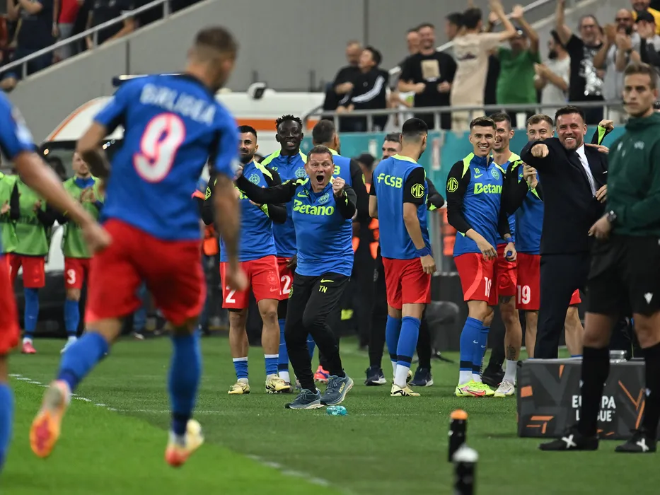 Thomas Neubert, Valentin Crețu, Baba Alhassan, Octavian George Popescu, Iliuță Daniel Popa si Doru Mihai Pintilii se bucutra dupa un gol marcat de catre George Daniel Bîrligea in meciul dintre FCSB si RFS, din cadrul UEFA Europa League, desfasurat pe Arena Nationala din Bucuresti, joi 26 septembrie 2024. © FOTO:Razvan Pasarica/SPORT PICTURES