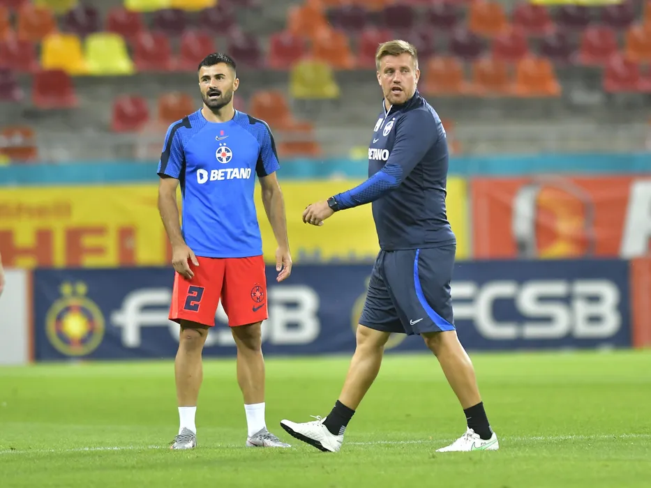 Mihai Pintilii la incalzire alaturi de Valentin Cretu la meciul de fotbal dintre FCSB si Chindia Targoviste, contand pentru Superliga Superbet, desfasurat pe Arena Nationala din Bucuresti, duminica 14 august 2022. © FOTO:Razvan Pasarica/SPORT PICTURES