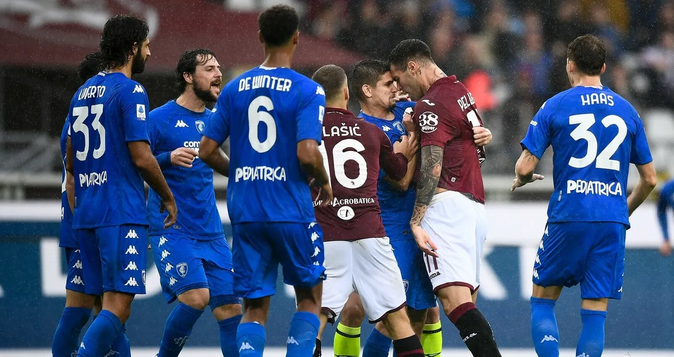 TURIN, ITALY - October 09, 2022: Pietro Pellegri of Torino FC argues with Razvan Marin of Empoli FC during the Serie A football match between Torino FC and Empoli FC.,Image: 729351723, License: Rights-managed, Restrictions: *** World Rights ***, Model Release: no