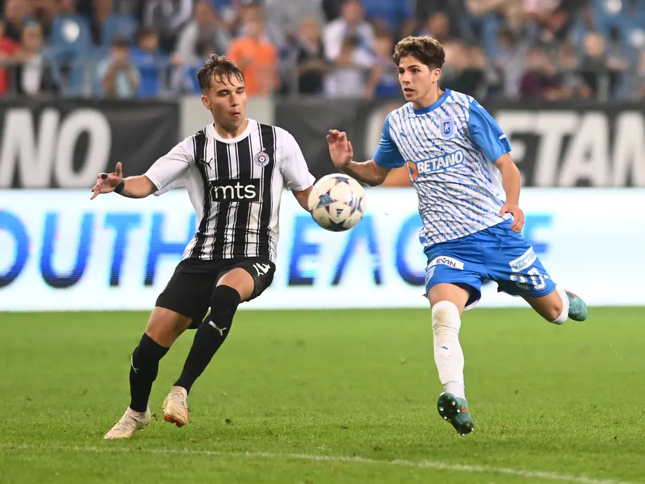 Aleksa Ćelić si Stefan Bana in meciul de fotbal dintre Universitatea Craiova U21 si Partizan Belgrad U21, contand pentru UEFA Youth League, desfasurat pe Stadionul Ion Oblemenco din Craiova, miercuri 4 octombrie 2023. © FOTO:Razvan Pasarica/SPORT PICTURES