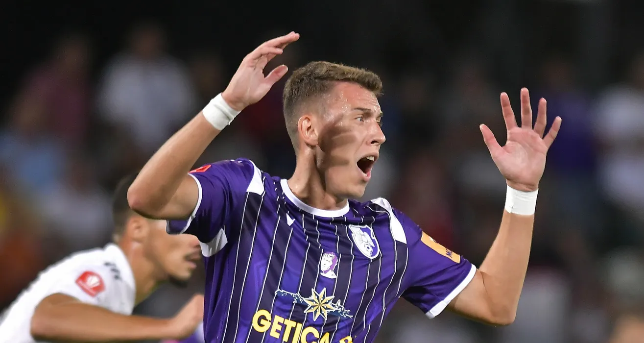 Mihai Alexandru Isfan reactioneaza in meciul de fotbal dintre FC Arges si FC U Craiova, contand pentru Superliga Superbet, desfasurat pe Stadionul Nicolae Dobrin din Pitesti, sambata 12 august 2022. © FOTO:Razvan Pasarica/SPORT PICTURES