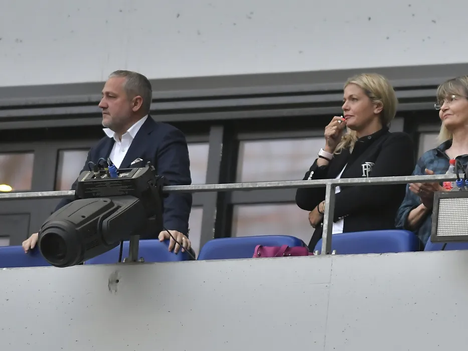 Mihai Rotaru si Lorena Trica privesc din tribuna intrarea lui Atanas Ioan Trica pe teren in meciul de fotbal dintre Universitatea Craiova si Academica Clinceni, contand pentru Play off-ul Ligii 1 Casa Pariurilor, desfasurat pe Stadionul Ion Oblemenco din Craiova, miercuri 26 mai 2021. © FOTO:Razvan Pasarica/SPORT PICTURES