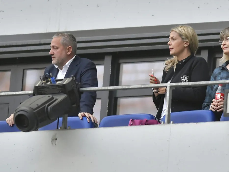 Mihai Rotaru si Lorena Trica privesc din tribuna intrarea lui Atanas Ioan Trica pe teren in meciul de fotbal dintre Universitatea Craiova si Academica Clinceni, contand pentru Play off-ul Ligii 1 Casa Pariurilor, desfasurat pe Stadionul Ion Oblemenco din Craiova, miercuri 26 mai 2021. © FOTO:Razvan Pasarica/SPORT PICTURES