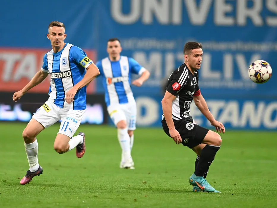 Nicusor Silviu Bancu si Mihaita Alexandru Chipciu in meciul de fotbal dintre Universitatea Craiova si Universitatea Cluj, contand pentru Superliga Superbet, desfasurat pe Stadionul Ion Oblemenco din Craiova, sambata 5 noiembrie 2022. © FOTO:Razvan Pasarica/SPORT PICTURES