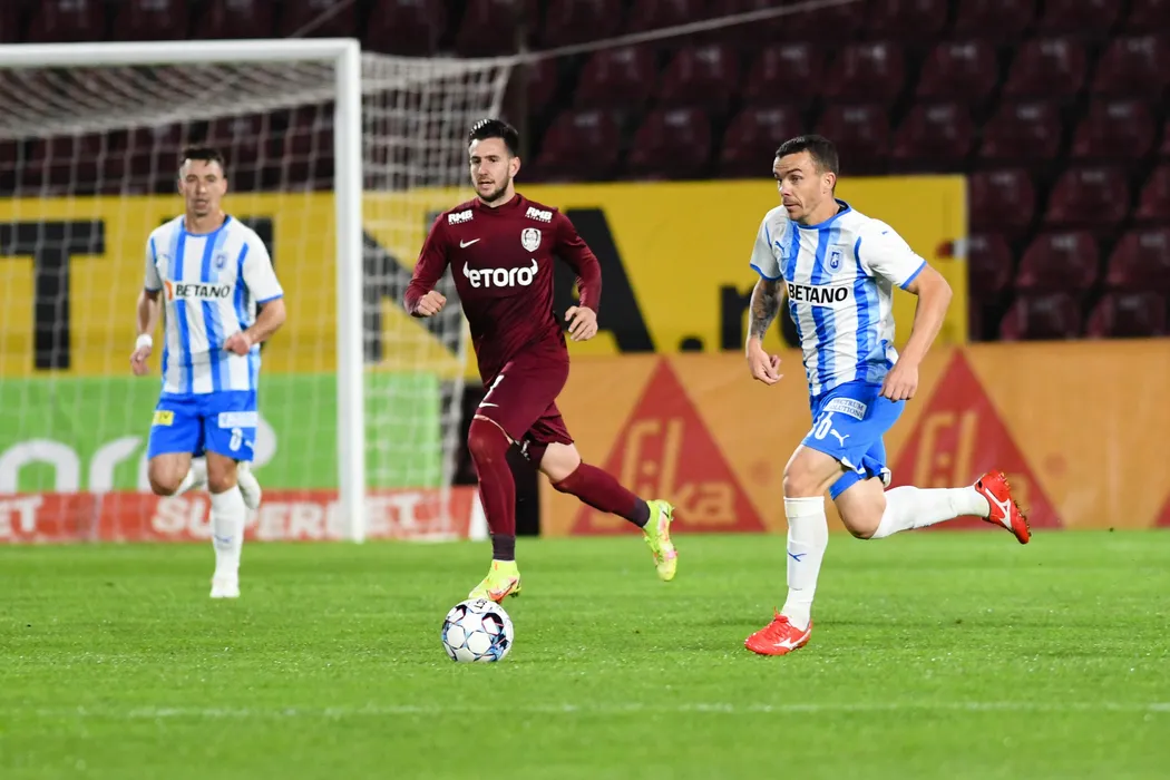 Alexandru Paun (C), de la CFR Cluj, lupta pentru balon cu Dan Nistor (D), de la CS Universitatea Craiova, in meciul de fotbal din etapa a IX - a a Ligii 1, disputat pe stadionul Dr. Constantin Radulescu, luni, 20 septembrie 2021. FLAVIU BUBOI / MEDIAFAX FOTO