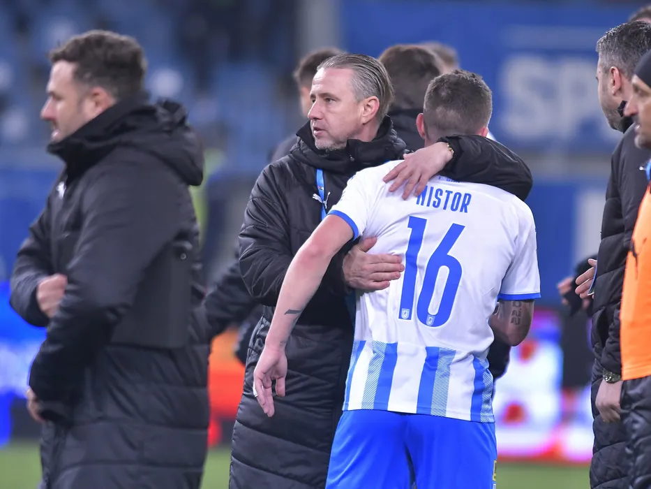 Laurentiu Aurelian Reghecampf il felicita pe Dan Nicolae Nistor dupa meciul de fotbal dintre Universitatea Craiova si Farul Constanta, contand pentru Liga 1 Casa Pariurilor, desfasurat pe Stadionul Ion Oblemenco din Craiova, luni 7 martie 2022. © FOTO:Razvan Pasarica/SPORT PICTURES