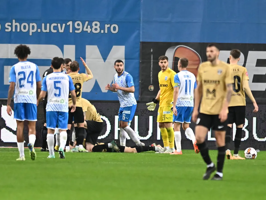 Screciu Vladimir Ionuț si Iulian Laurențiu Popescu în meciul de fotbal dintre Universitatea Craiova si FC Voluntari, contând pentru Superliga Superbet, desfășurat pe Stadionul Ion Oblemenco din Craiova, luni 26 februarie 2024. © FOTO: Răzvan PĂSĂRICĂ/SPORT PICTURES