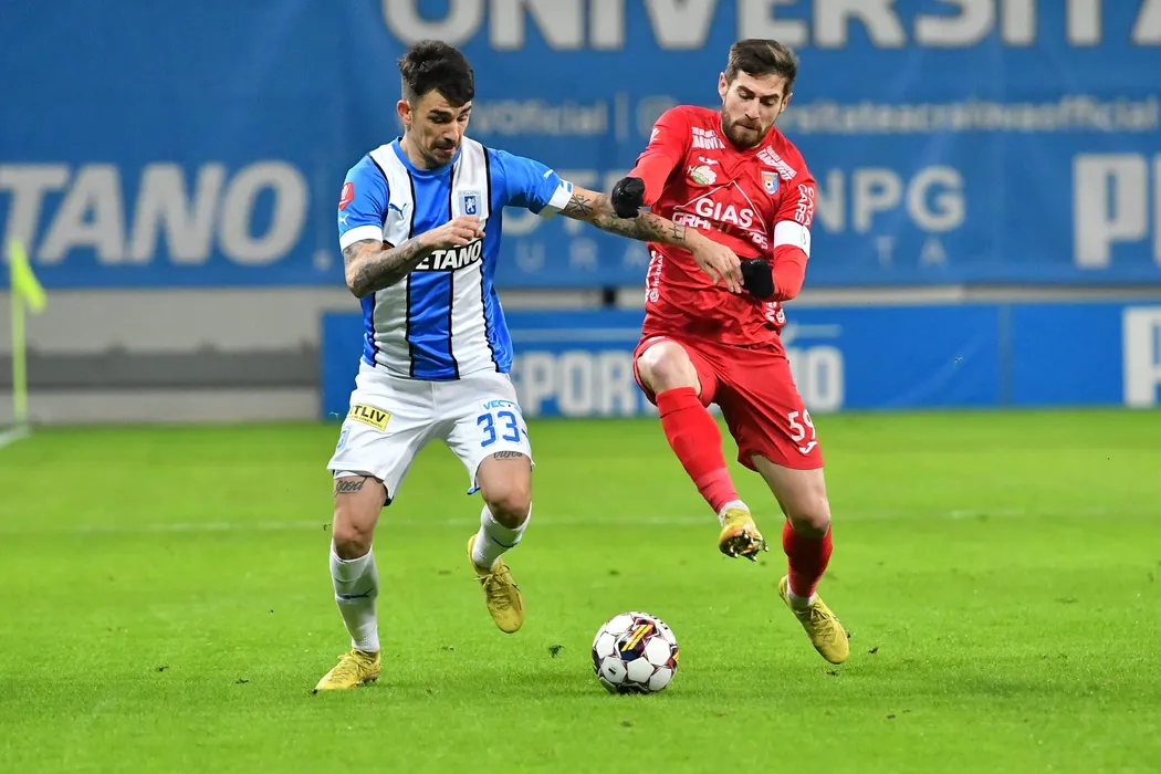 Sergiu Hanca (S), de la CS Universitatea Craiova, lupta pentru balon cu Doru Popadiuc (D), de la AFC Chindia Targoviste, in meciul de fotbal din etapa a XXI-a a Superligii, disputat pe stadionul Ion Oblemenco din Craiova, sambata, 17 decembrie 2022. REMUS BADEA / MEDIAFAX FOTO